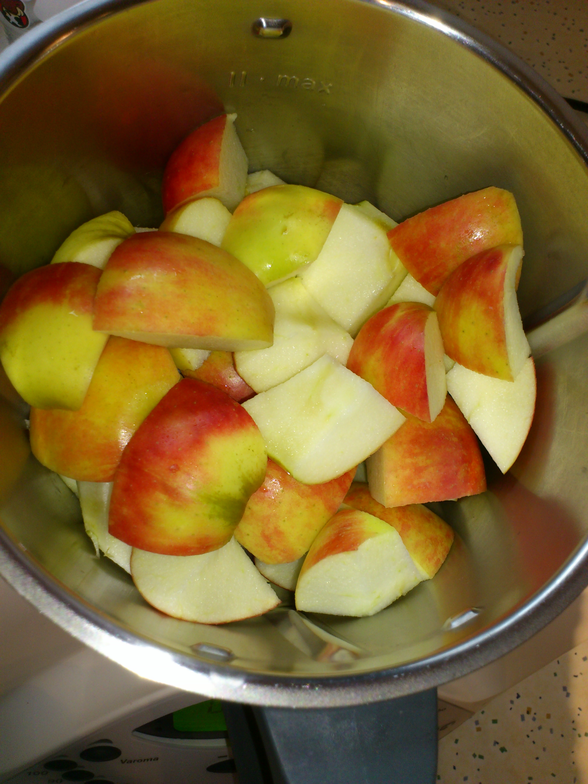 ApfelkompottUnd so kinderleicht ist die Zubereitung. Apfelstücke in den Mixtopf. Alle restlichen Zutaten einfüllen, kurz 4 Sec./Stufe 4,  9 Minuten – 100 Grad – Stufe 1. Am Ende der Kochzeit 20 Sec./Stufe 8 pürieren. Fertig!  Super köstlich!  Tipp: Bei ganz rotbackigen Äpfeln wird der Kompott rosa. Dafür ist der rote Boskoop super geeignet. Bei dem Elstar nehme ich 10 g weniger Zucker, weil diese Sorte süßer ist.