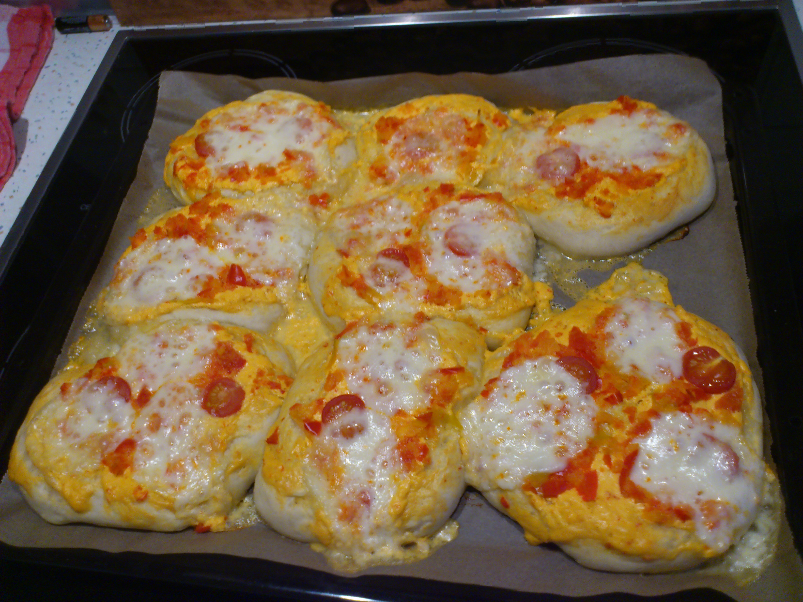 200 g Gouda 5 Sek./Turbo zerkleinern und umfüllen, 400 g Mehl, 1 Würfel Hefe, 1 TL Salz, 1 Pr. Zucker, 200 g Wasser, 50 g Öl, 1 Min./Teigstufe kneten. Anschließend kleine Fladen auf einem Backblech ausrollen und ca. 15 Min. bei 50 c° im Backofen gehen lassen. 200 g Brunch Paprika & Peperoni darauf verteilen,  je 1 rote, gelbe und grüne Paprika 3 Sek./Stufe 5 zerkleinern und auf dem Aufstrich verteilen, DSC_0561zum Schluß mit Gouda bestreuen. Backofen auf 170 C° – 200 C° ca. 15 Minuten backen. Ích hatte keinen Gouda mehr und habe statt dessen Mozzaralle genommen. Wir haben diese Brunch Pizza auch auf einem der letzten Kochtreffs zubereitet. Es hat allen sehr, sehr gut geschmeckt.